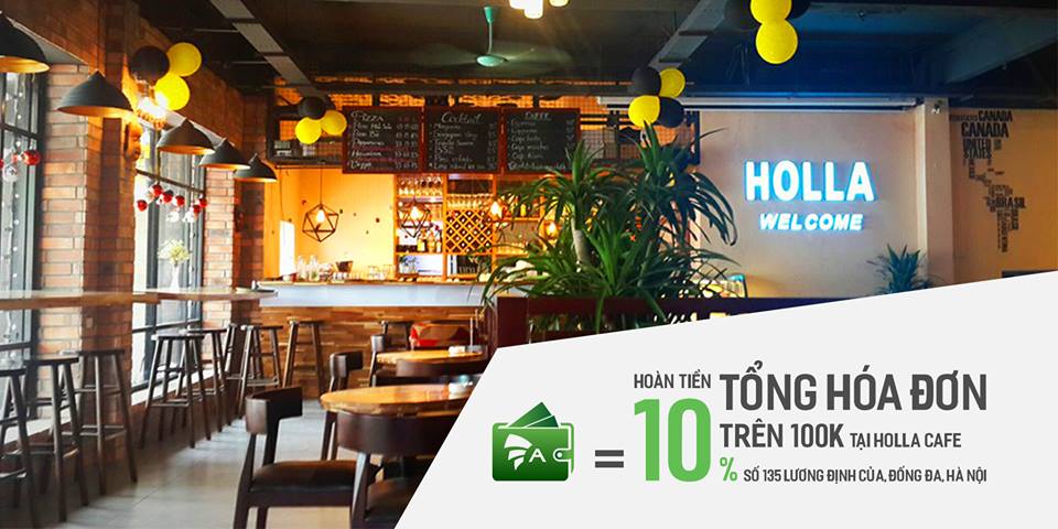Hiện nay, Holla Cafe áp dụng mức hoàn tiền lên đến 10% tổng hóa đơn trên 100k cho khách hàng thanh toán bằng Ví Appota.